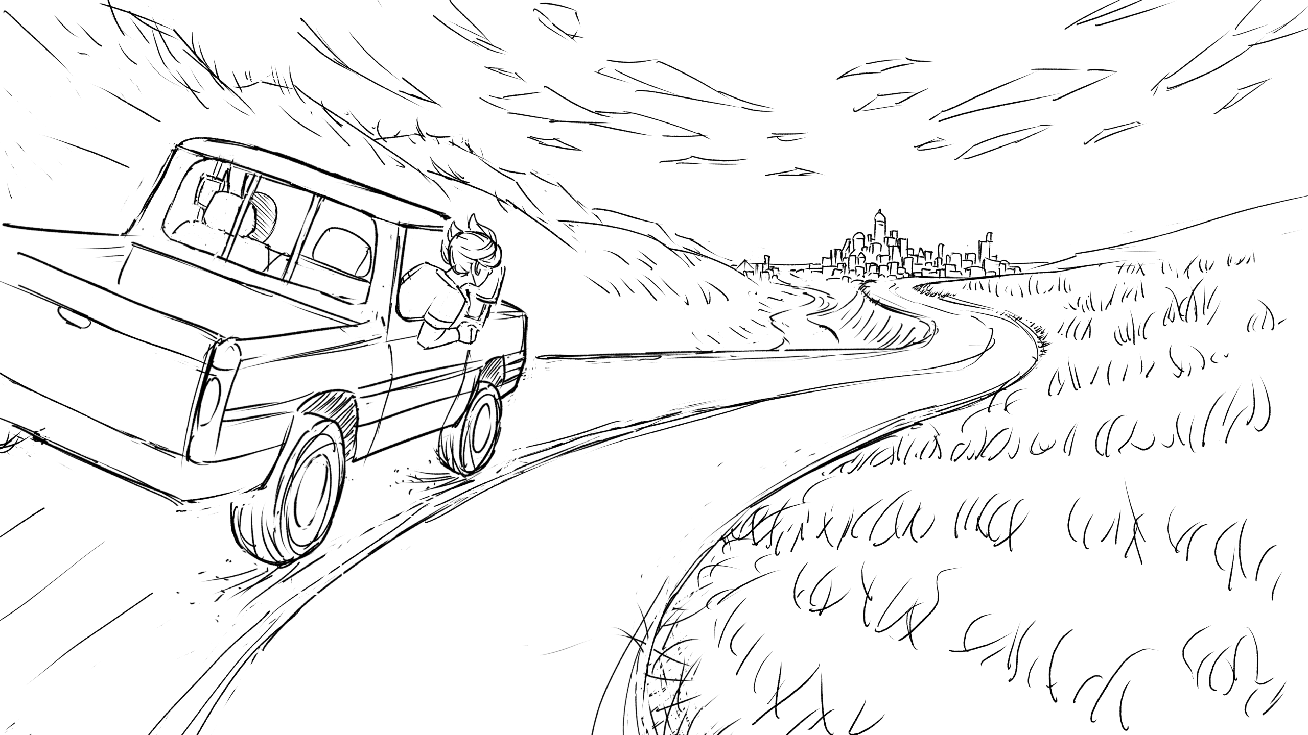 With the engine running at a red-hot roar, Mrs. Berros’s truck barreled its way along a long arcing road at the base of the nearby mountain range, following a thin river that led to a port city in the distance. A skyline stood etched against the glimmering ocean behind it, bursting with skyscrapers that looked like crystals emerging from a stone. Carnelia leaned out of the passenger window and let out a whoop as fresh salty air blasted her in the face.